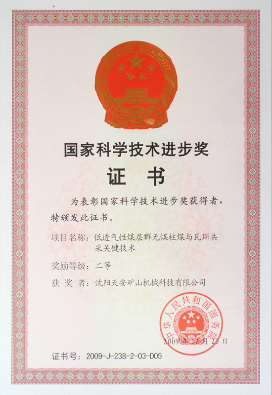 沈阳天安矿山机械科技有限公司等六家企业和院校、科研机构共同研发完成的“低透气性煤层群无煤柱煤与瓦斯共采关键技术”,被授予“2009年度国家科技进步二等奖“。