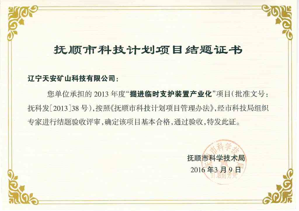 抚顺市科技计划项目结题证书-掘进临时支护装置产业化