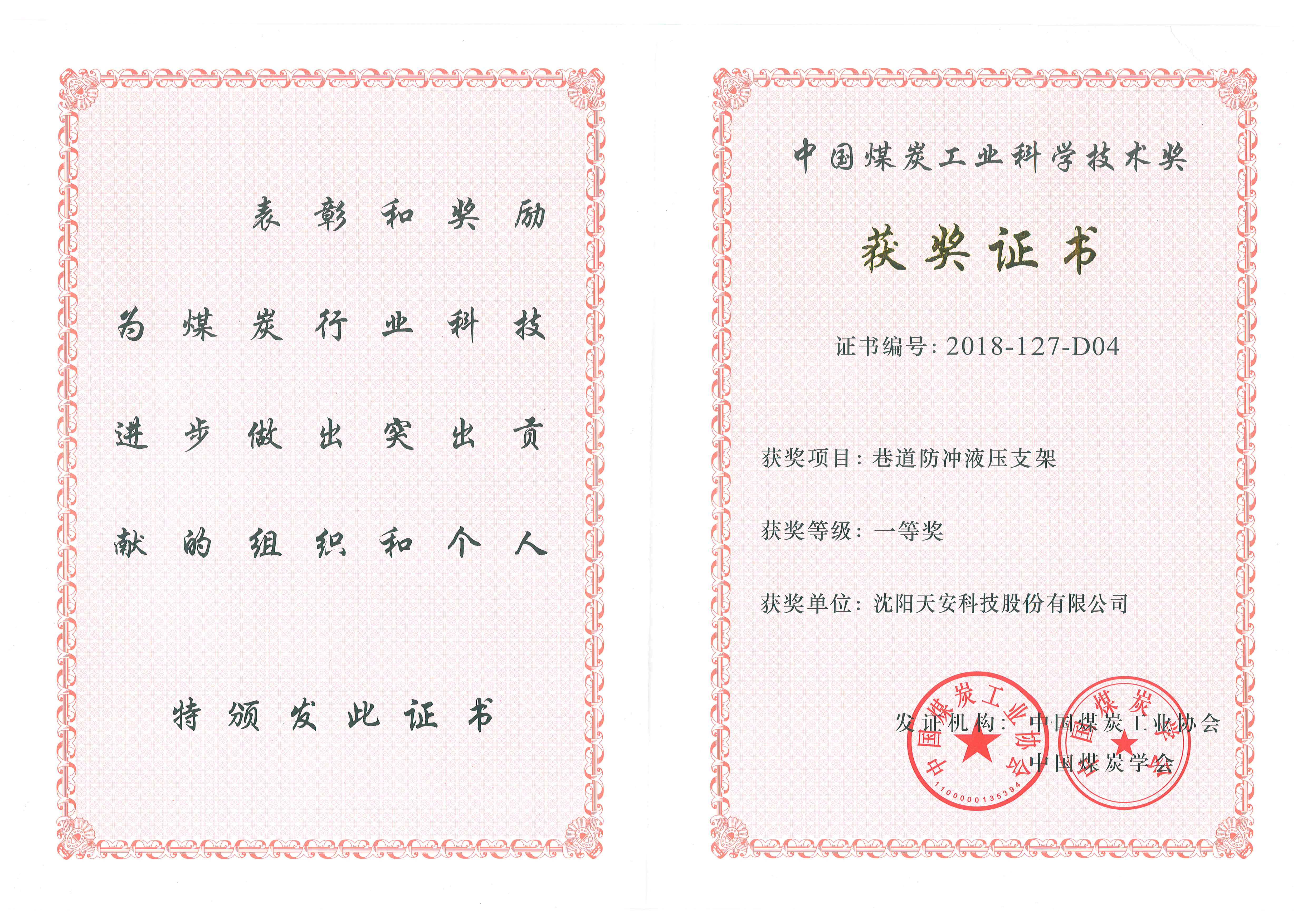 中国煤炭工业科学技术奖一等奖-巷道防冲液压支架